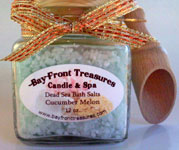 Our Bath Salts include 100% Pure Dead Sea Salt. Research has shown that there are several benefits to relaxing in Dead Sea Salts when used on a regular basis. Magnesium: Is important for both combating stress and fluid retention, slowing skin aging and calming the nervous system. Calcium is effective at preventing water retention, increasing circulation and strengthening bones and nails. Potassium energizes the body, helps to balance skin moisture and is a crucial mineral to replenish following intense exercise. Bromides act to ease muscle stiffness and relax muscles. Sodium is important for the lymphatic fluid balance (this in turn is important for immune system function). So bathing in high quality Sea Salt can help to replenish the minerals which are critical to our skin metabolism. Salts arrive in an 8 ounce jar, wrapped with ribbon and has a wooden scoop attached. |